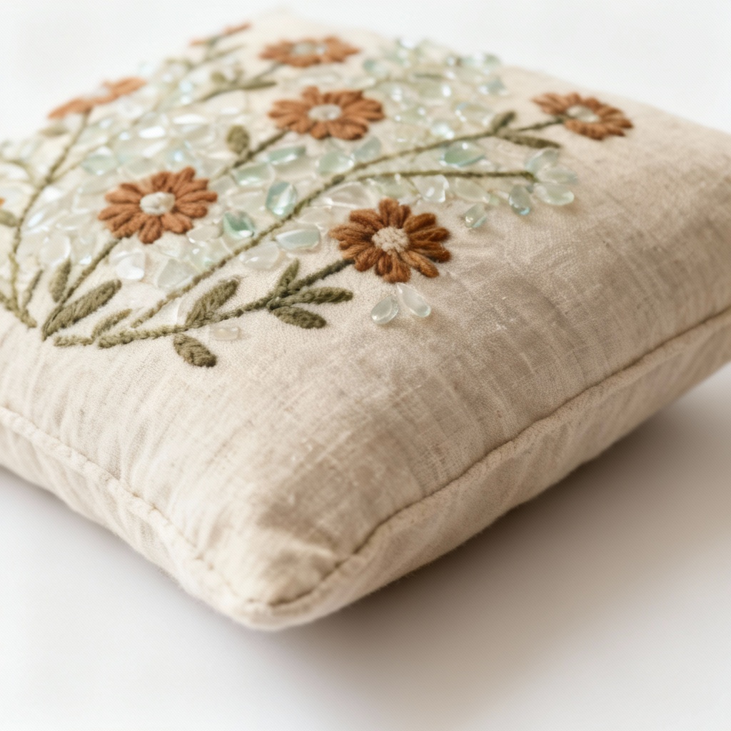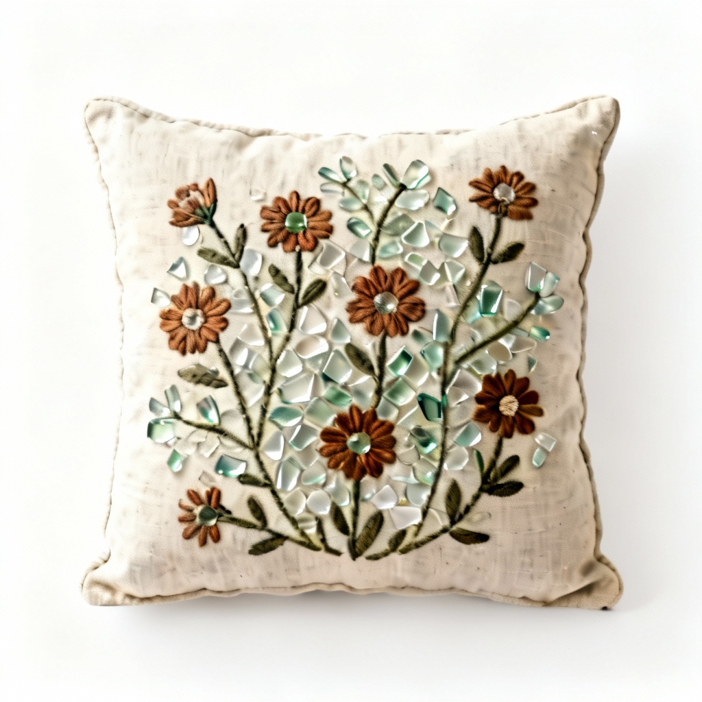 Artisan Glass Shard Embroidered Pillow – Rustic Floral Design, 12×12 Inch