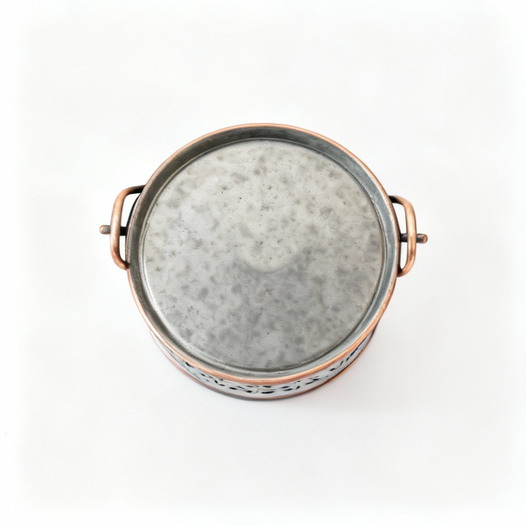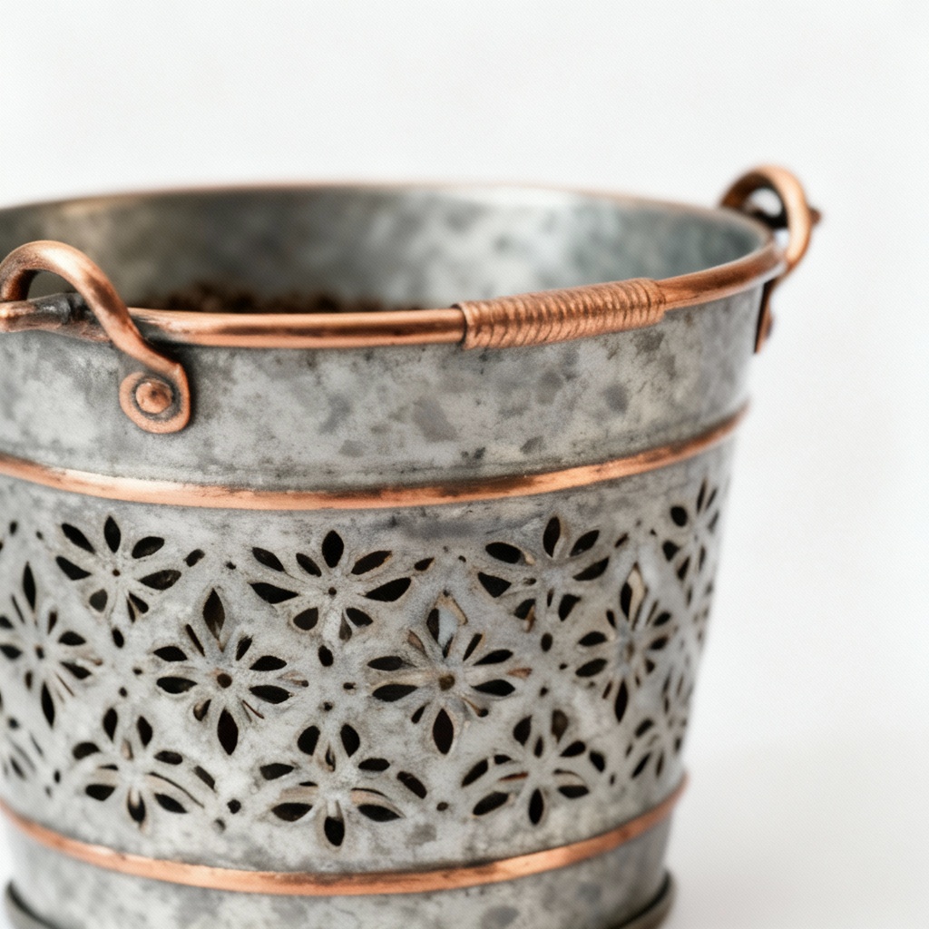 Bring a touch of rustic charm to your indoor space with this beautifully crafted metal planter. The planter features a unique etched design that adds texture and visual interest, complemented by delicate copper detailing around the rim and base. Perfect for displaying small herbs, succulents, or flowers, this planter is ideal for adding a touch of greenery to windowsills, shelves, or desks. Crafted from durable metal, this planter is built to last and withstand daily use. The copper accents provide a warm, contrasting element that enhances its overall aesthetic appeal. Its compact size makes it suitable for smaller spaces, while its rustic artisan style adds a touch of character to any room. The planter measures 4 inches in diameter and 3 inches in height, providing ample space for plant growth. A small drainage hole is included to prevent overwatering and ensure healthy plant growth. The etched pattern is carefully applied by hand, making each planter a unique piece of art. This planter makes a thoughtful gift for gardening enthusiasts or anyone who appreciates handcrafted decor. Enhance your home decor with this charming and functional metal planter.
