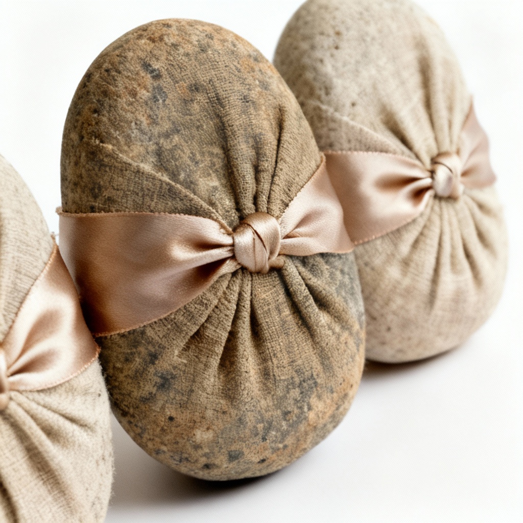 Add a touch of rustic charm to your home with this unique set of three fabric-wrapped stones. Each stone is carefully selected for its smooth surface and natural beauty, then meticulously wrapped in durable, high-quality fabric. Delicate silk embellishments, hand-stitched onto the fabric, add a subtle touch of elegance and visual interest. These stones are perfect as decorative accents on shelves, desks, or windowsills, bringing a natural and earthy element to any space. They can also be used as paperweights or simply enjoyed as tactile objects. The fabric wrapping provides a comfortable and warm feel, while the silk accents catch the light beautifully. Each stone is unique, with variations in size and shape adding to its individual character. This set includes three stones, approximately 2-3 inches in diameter and weighing between 4-6 ounces each. The fabric is securely adhered to the stone, ensuring long-lasting durability. To clean, simply wipe with a dry cloth. Avoid prolonged exposure to moisture. These fabric-wrapped stones are a thoughtful and original gift for nature lovers, art enthusiasts, or anyone seeking a unique and handcrafted decorative piece. They are a simple yet impactful way to bring the beauty of the outdoors inside. The primary fabric color is a natural beige, complemented by subtly contrasting silk threads in shades of cream and light brown. Each stone is individually crafted, making each set truly one-of-a-kind.