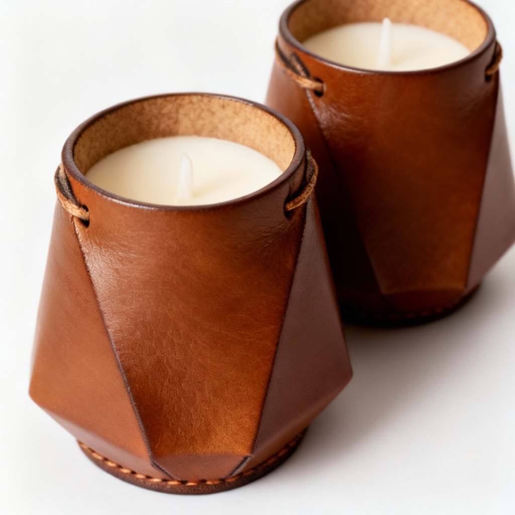 The geometric design features clean lines and precise angles, creating a visually striking focal point. Each holder is meticulously crafted to ensure stability and durability, capable of holding standard tealight or votive candles. The leather is treated with a protective finish, making it resistant to minor spills and easy to clean. Simply wipe down with a damp cloth to maintain its pristine condition.