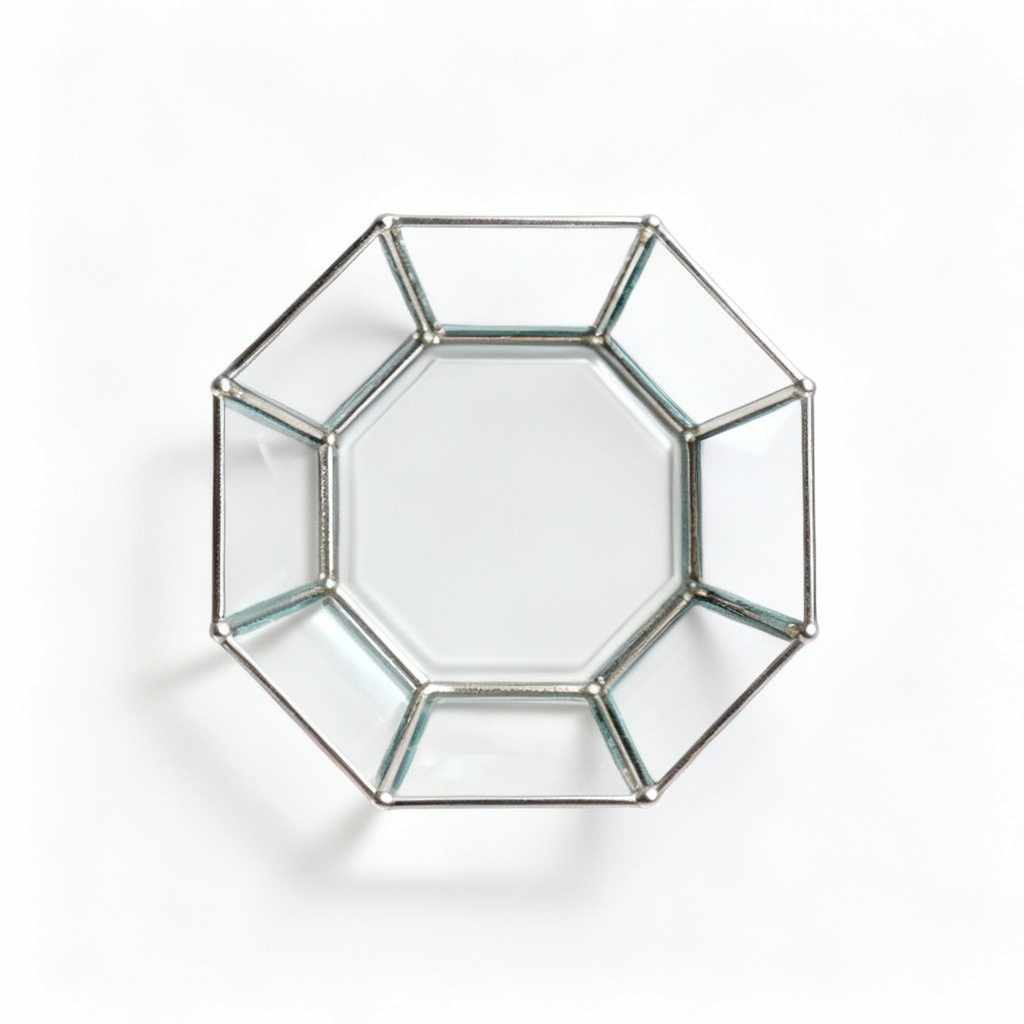 Add a touch of modern elegance to your space with this handcrafted geometric catchall dish. This unique piece features carefully cut and arranged pieces of high-quality clear glass, meticulously joined with delicate lines of stained metal. The minimalist design showcases the beauty of the glass and metal, creating a striking visual effect. Perfect for holding keys, jewelry, small trinkets, or even as a decorative accent on a desk or shelf. Each dish is handcrafted with precision and care, ensuring a one-of-a-kind piece. The geometric pattern offers a contemporary aesthetic that complements any modern decor. The dish measures approximately 6 inches in diameter and 1 inch in height, making it a versatile and practical addition to your home. The smooth glass surface is easy to clean and maintain, while the sturdy construction ensures long-lasting durability. This catchall dish is not only a functional item but also a beautiful work of art that will enhance the aesthetic of any room. Its simple yet sophisticated design makes it an ideal gift for birthdays, housewarmings, or any special occasion. The light reflects beautifully off the glass surfaces, adding a subtle sparkle to your space. The stained metal provides a contrasting element, highlighting the geometric shapes and adding visual interest. Place it on your entryway table, dresser, or bathroom counter to keep your essentials organized and within reach. This versatile dish also makes a stylish addition to your office, providing a convenient place to store paperclips, pens, or other small office supplies. Its clean lines and minimalist design make it a perfect fit for any modern workspace. The geometric design also makes it a striking display piece on its own. The combination of clear glass and stained metal creates a timeless aesthetic that will never go out of style. Add a touch of understated luxury to your home with this exquisite geometric catchall dish.