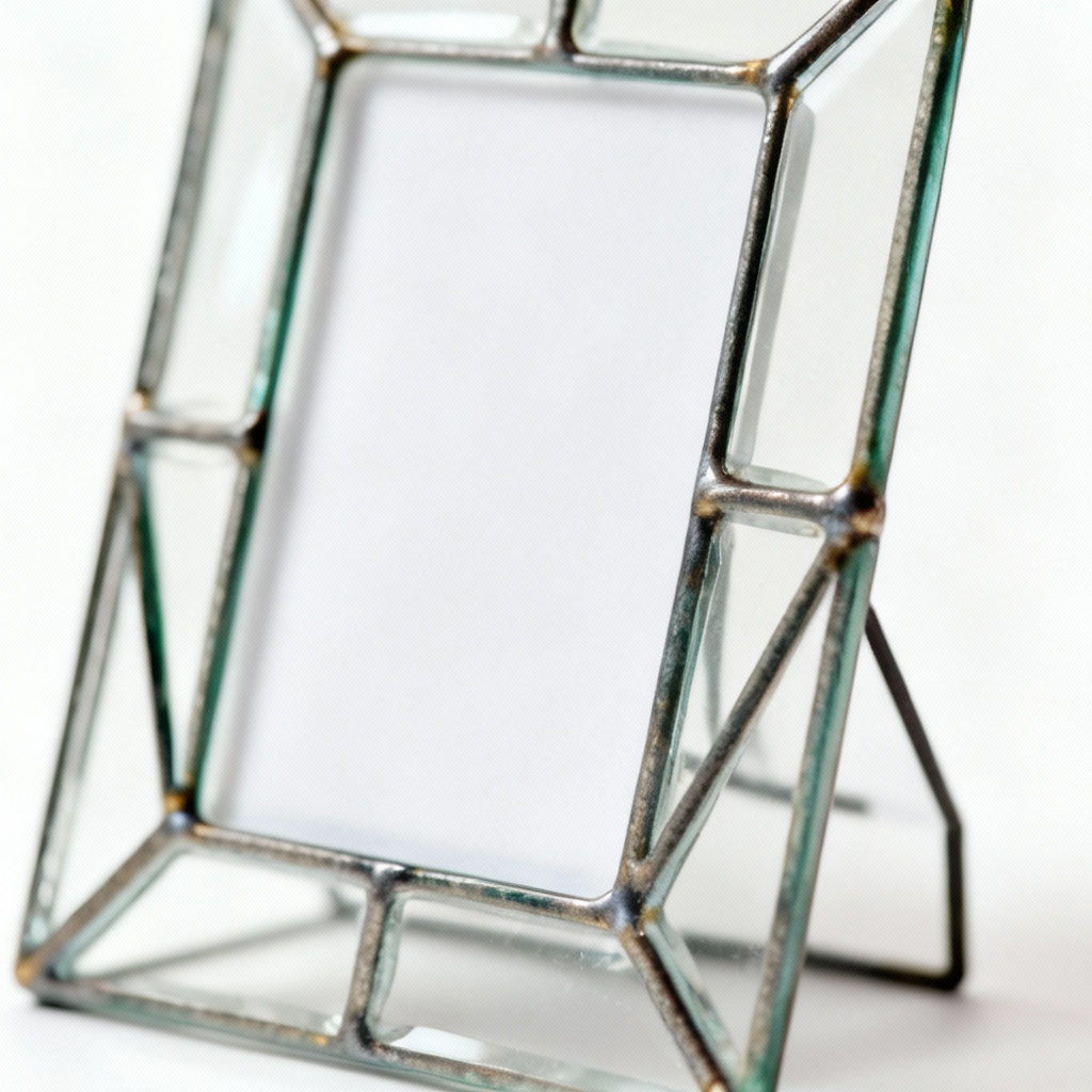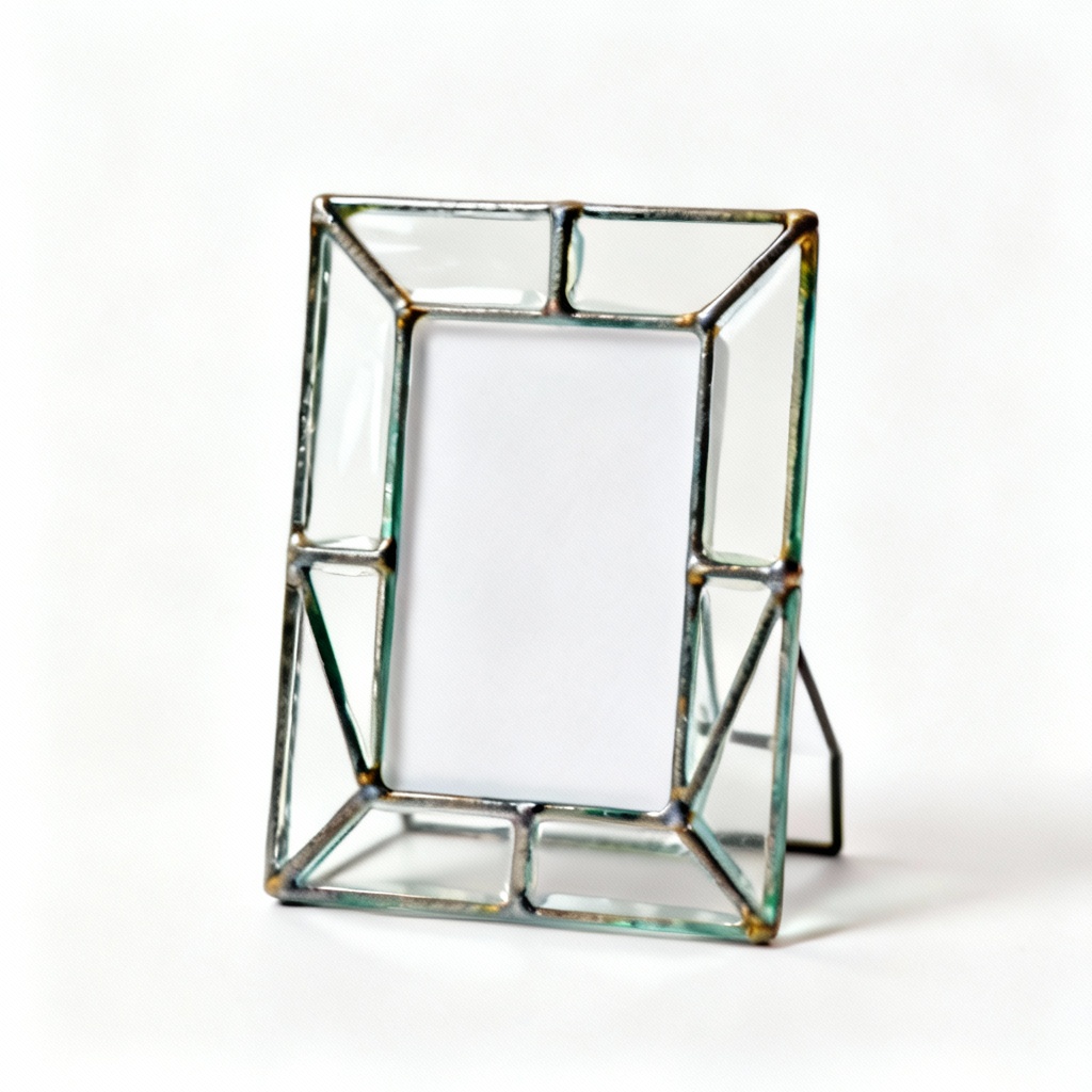 Display your cherished memories in style with this unique geometric stained glass photo frame. This handcrafted collage art piece combines clear glass panels with carefully selected stained glass accents to create a modern minimalist aesthetic. Each frame is meticulously assembled, showcasing vibrant colors and clean lines. The frame holds a standard 4×6 inch photograph, easily inserted and secured within the layered glass design. The stained glass elements are arranged in a geometric pattern, adding a touch of artistry and sophistication to any room. The frame is designed to stand independently on a tabletop or shelf. The inherent beauty of the glass allows light to filter through, enhancing the colors and creating a captivating visual effect. This frame is not only a functional way to display your photos but also a unique piece of art that will complement any decor. Perfect as a thoughtful gift for birthdays, anniversaries, housewarmings, or any special occasion. Dimensions: 6 inches (height) x 5 inches (width) x 1 inch (depth). The frame’s base is constructed from a sturdy, clear glass panel for stability. Each stained glass piece is carefully cut and fitted to ensure a seamless and visually appealing design. Easy to clean with a soft, dry cloth. Avoid using harsh chemicals or abrasive cleaners.