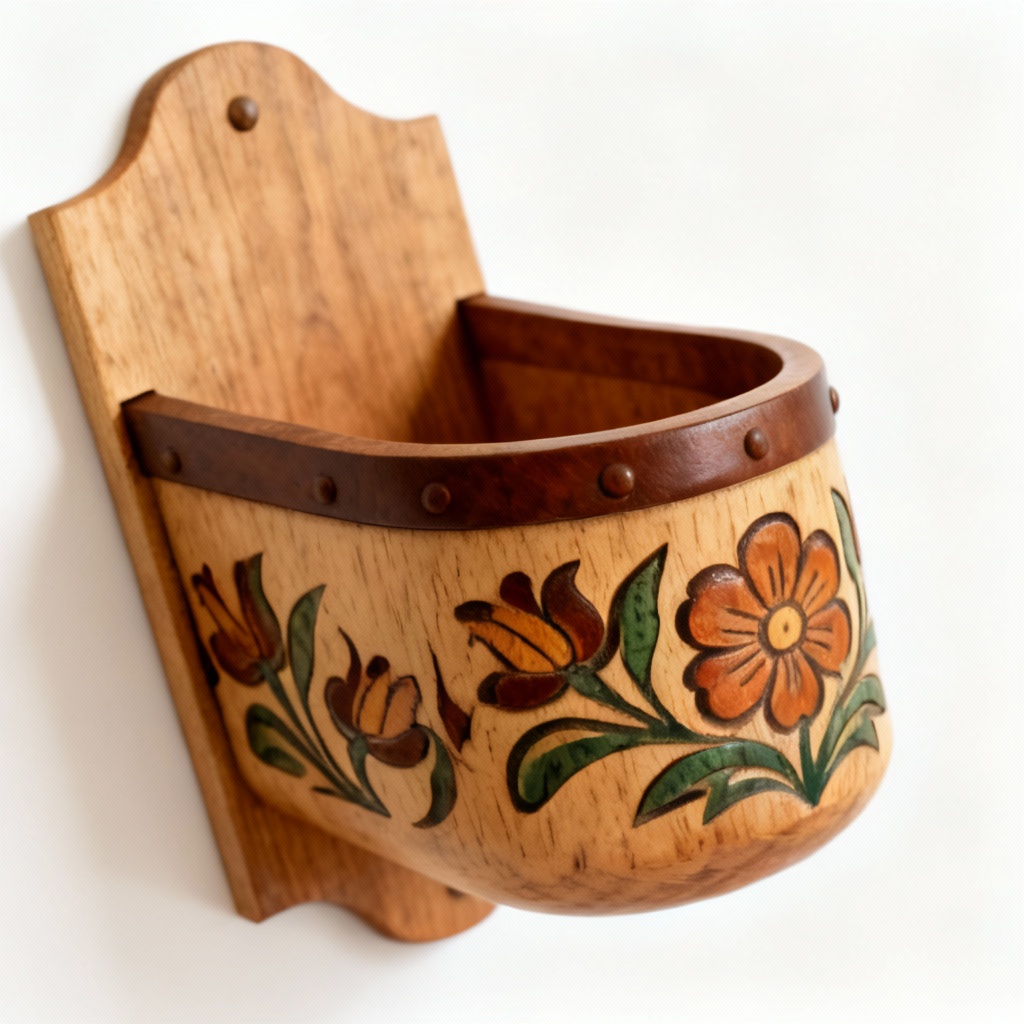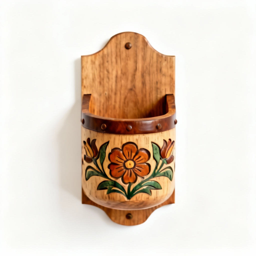 Hand-Carved Wooden Wall Pocket with Walnut Accent – Folk Art Floral Design