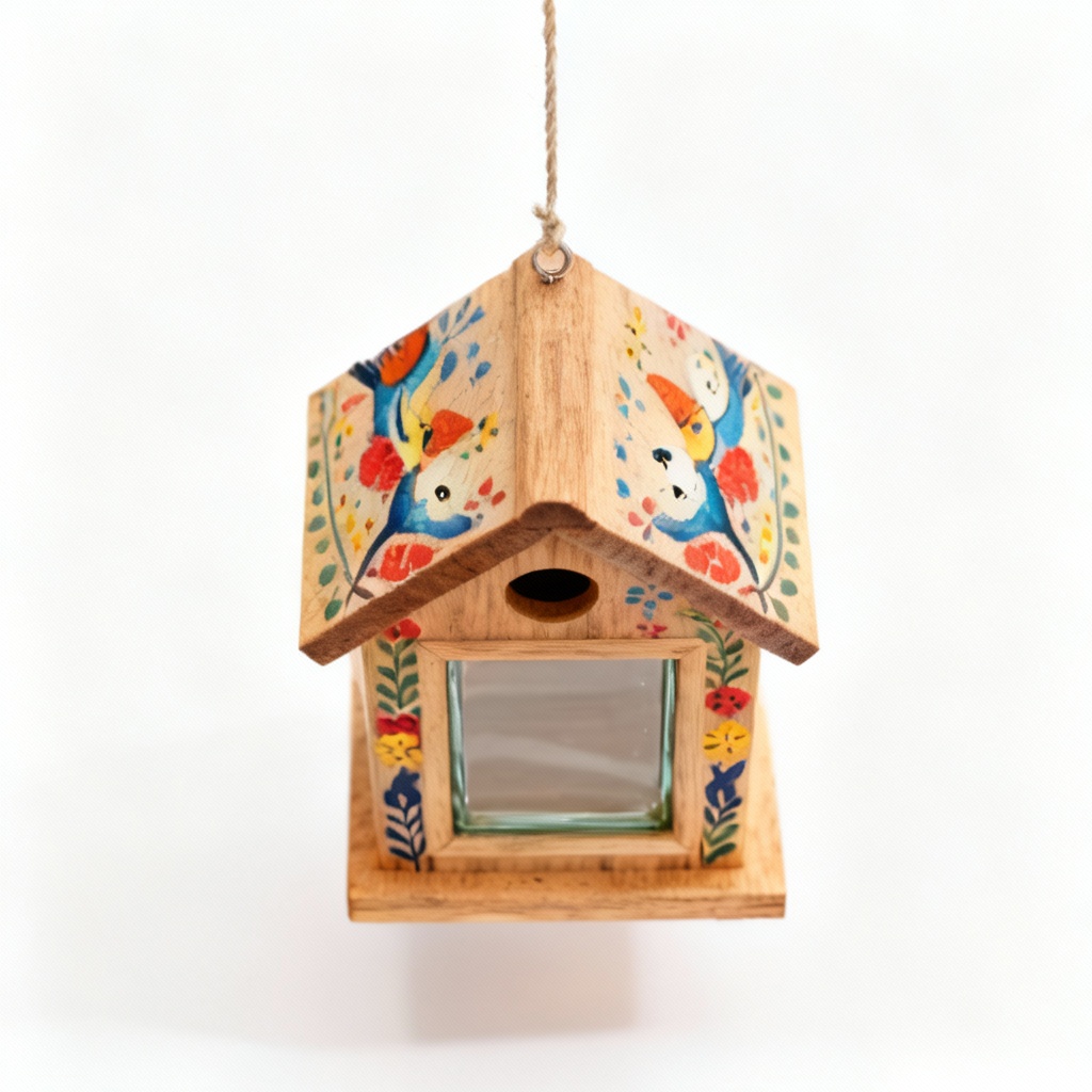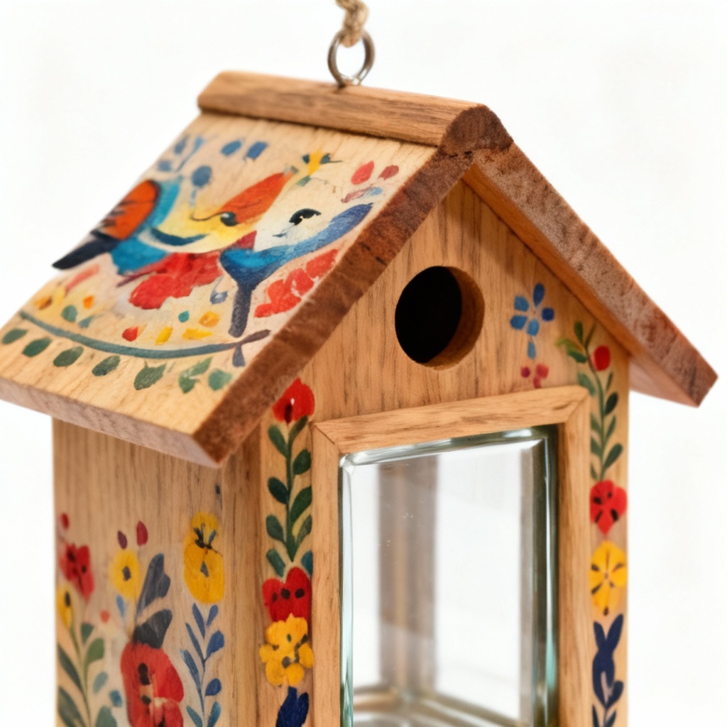 Hand-Painted Wooden Birdhouse with Blown Glass Window – Folk Art Design