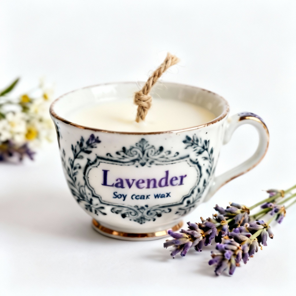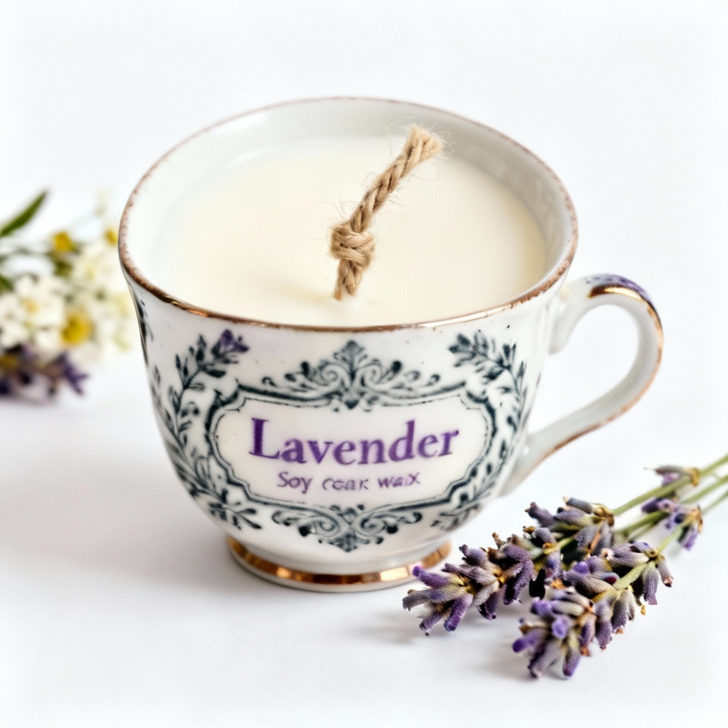 Hand-Poured Soy Wax Candle in Repurposed Teacup – Lavender Scent