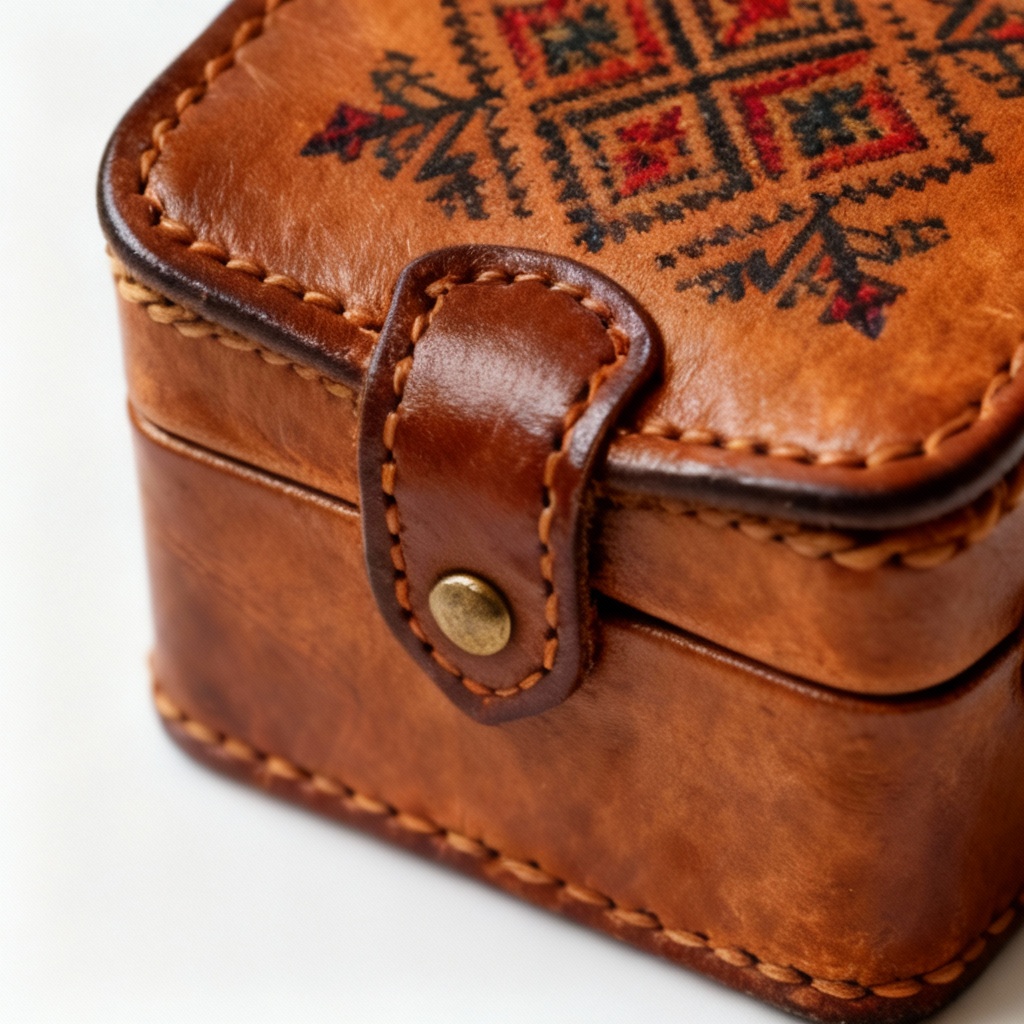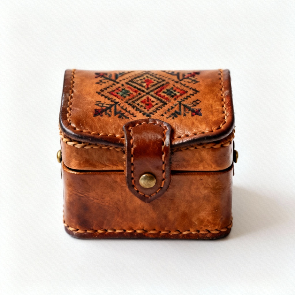Handcrafted Leather Trinket Box – Traditional Folk Design, Top-Grain Detail