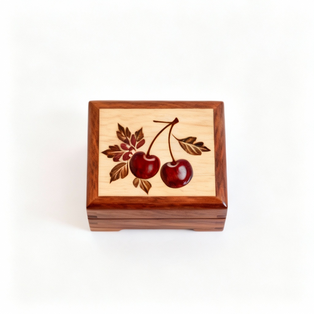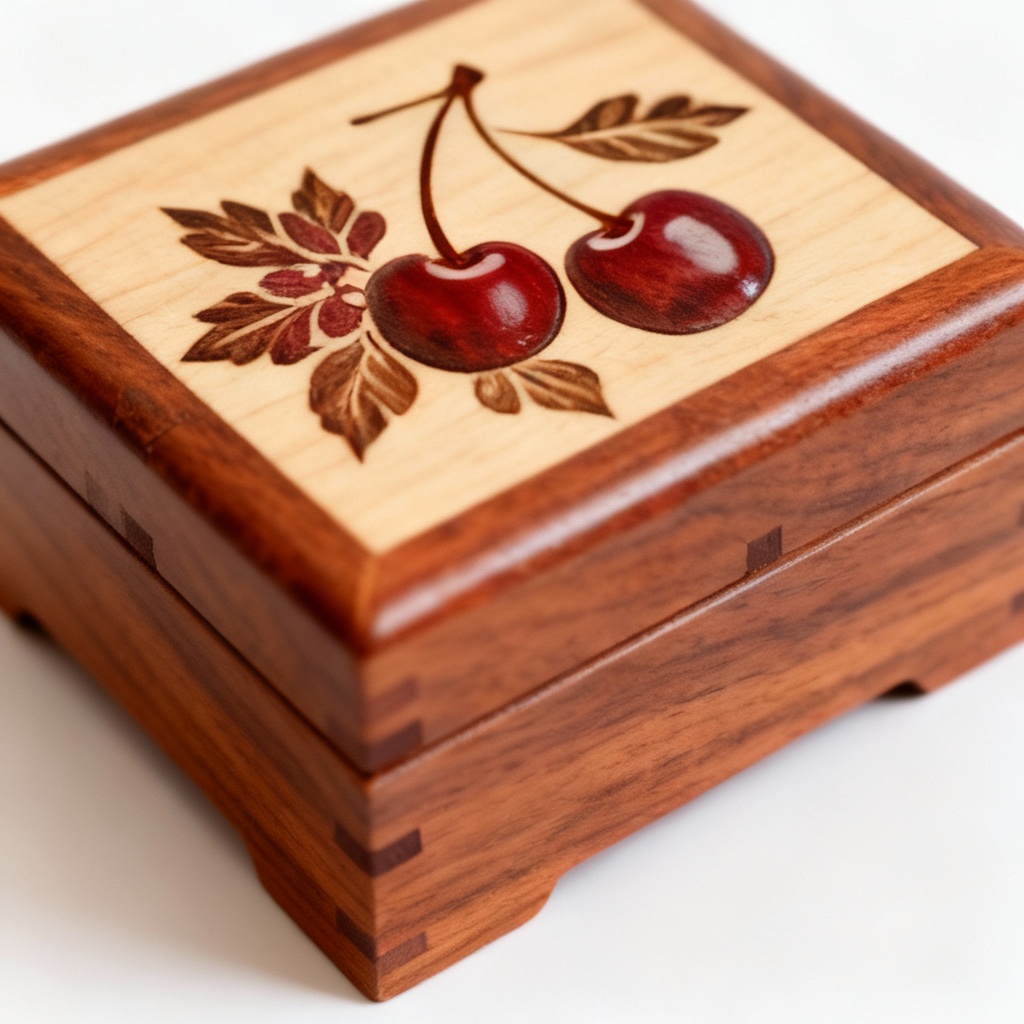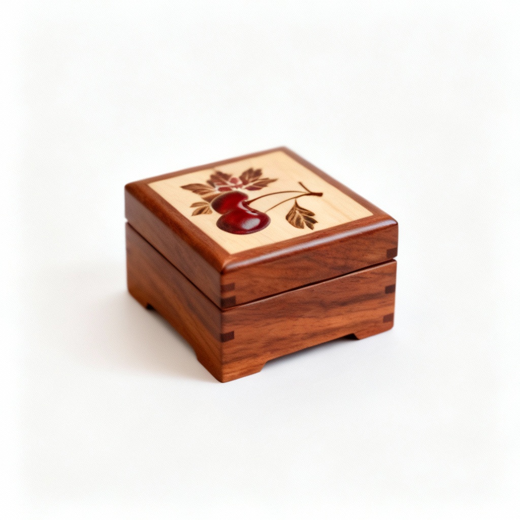 Handcrafted Wooden Keepsake Box with Cherry Inlay – Floral Design