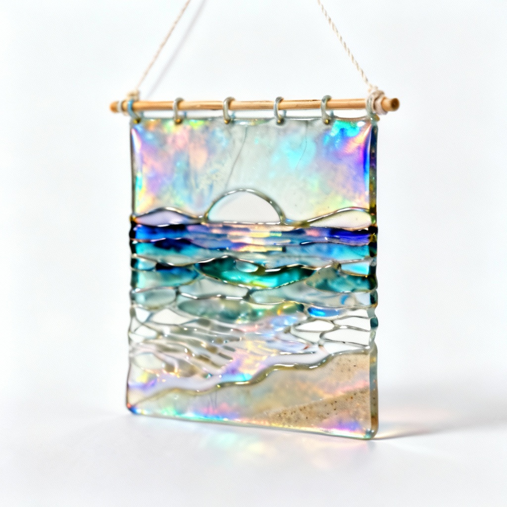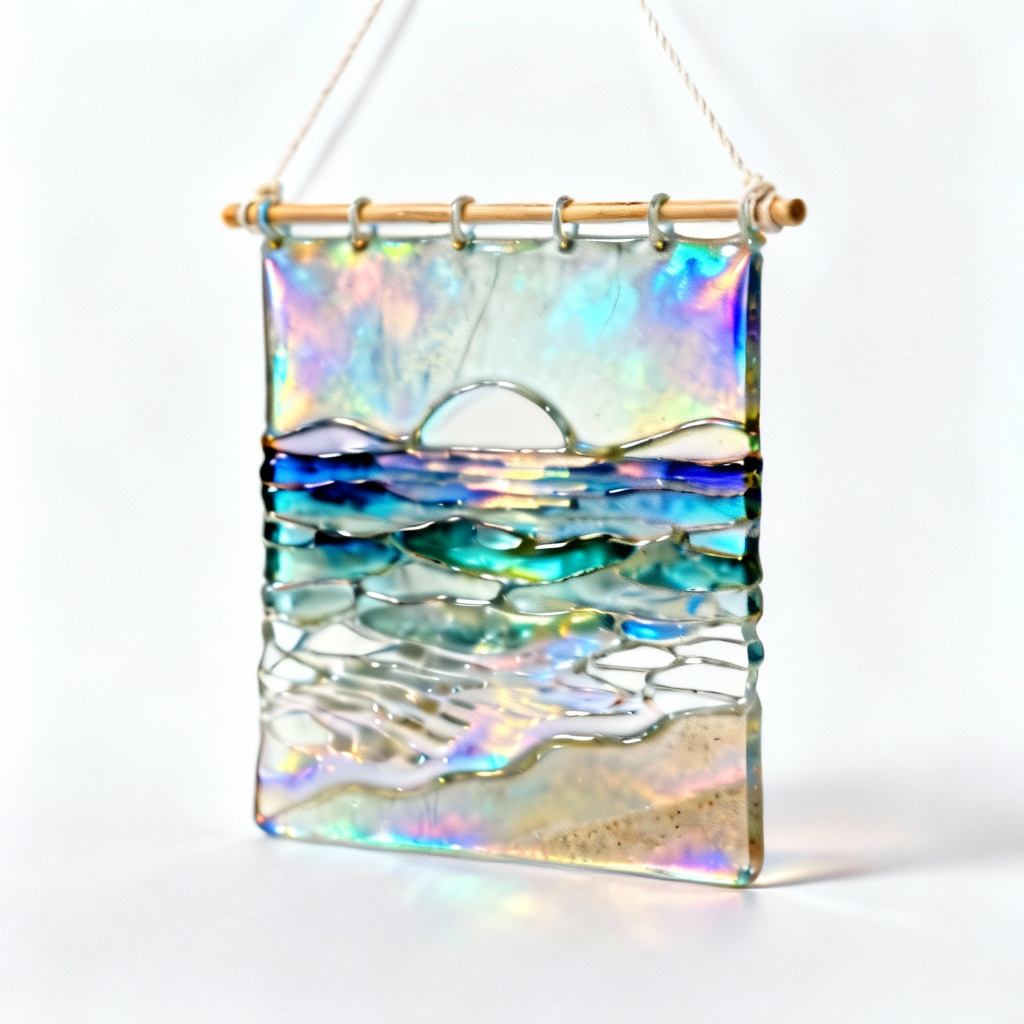 Iridescent Glass Tapestry Wall Hanging – Abstract Coastal Design, 8×12 Inches