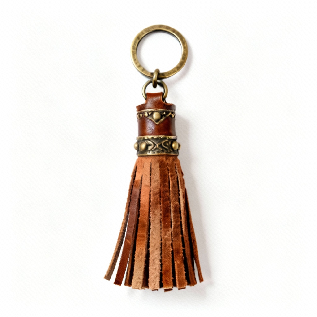 Add a touch of bohemian flair to your everyday essentials with this handcrafted leather and suede tassel keychain. This unique accessory combines the durability of genuine leather with the soft, tactile appeal of suede, creating a visually and texturally rich design. Each tassel is meticulously assembled by hand, ensuring a high level of quality and attention to detail. The keychain features varying lengths of leather and suede fringe, creating a dynamic and eye-catching effect. The leather portion is dyed in a warm, earthy brown, while the suede accents are available in a range of complementary colors (select your preferred color from the options available). The keychain also incorporates small, antique brass-finished metal beads for added visual interest and a touch of vintage charm. A sturdy metal keyring ensures secure attachment to your keys, bag, or backpack.