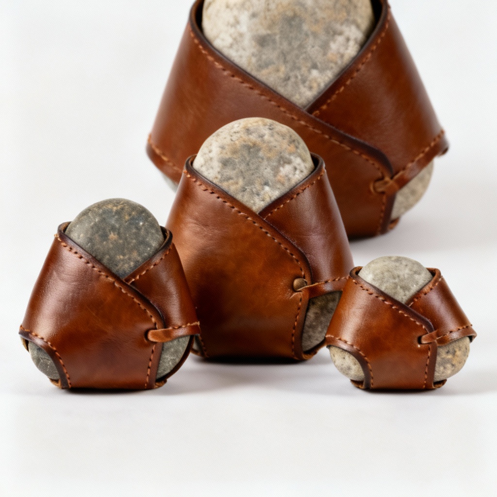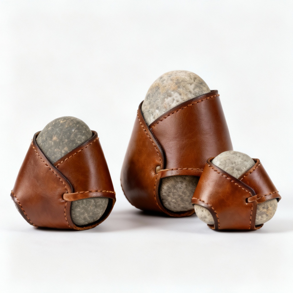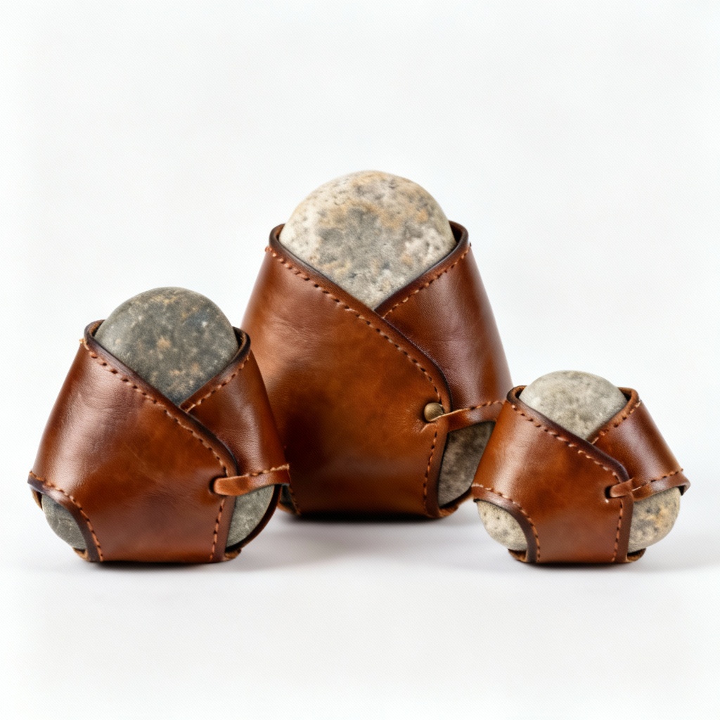 Bring a touch of natural elegance to your workspace with this set of three handcrafted paperweights. Each paperweight features a smooth, carefully selected river stone, partially wrapped in supple leather, creating a unique tactile experience. The leather is meticulously hand-stitched, ensuring durability and a refined aesthetic. The natural variations in the stones mean that no two sets are exactly alike, making each set a one-of-a-kind addition to your desk or home office. These paperweights are not only functional but also serve as beautiful decorative objects, adding a touch of organic charm to any setting. The leather provides a secure grip, preventing the stones from slipping on smooth surfaces. They are perfect for holding down papers, books, or simply as a decorative accent.