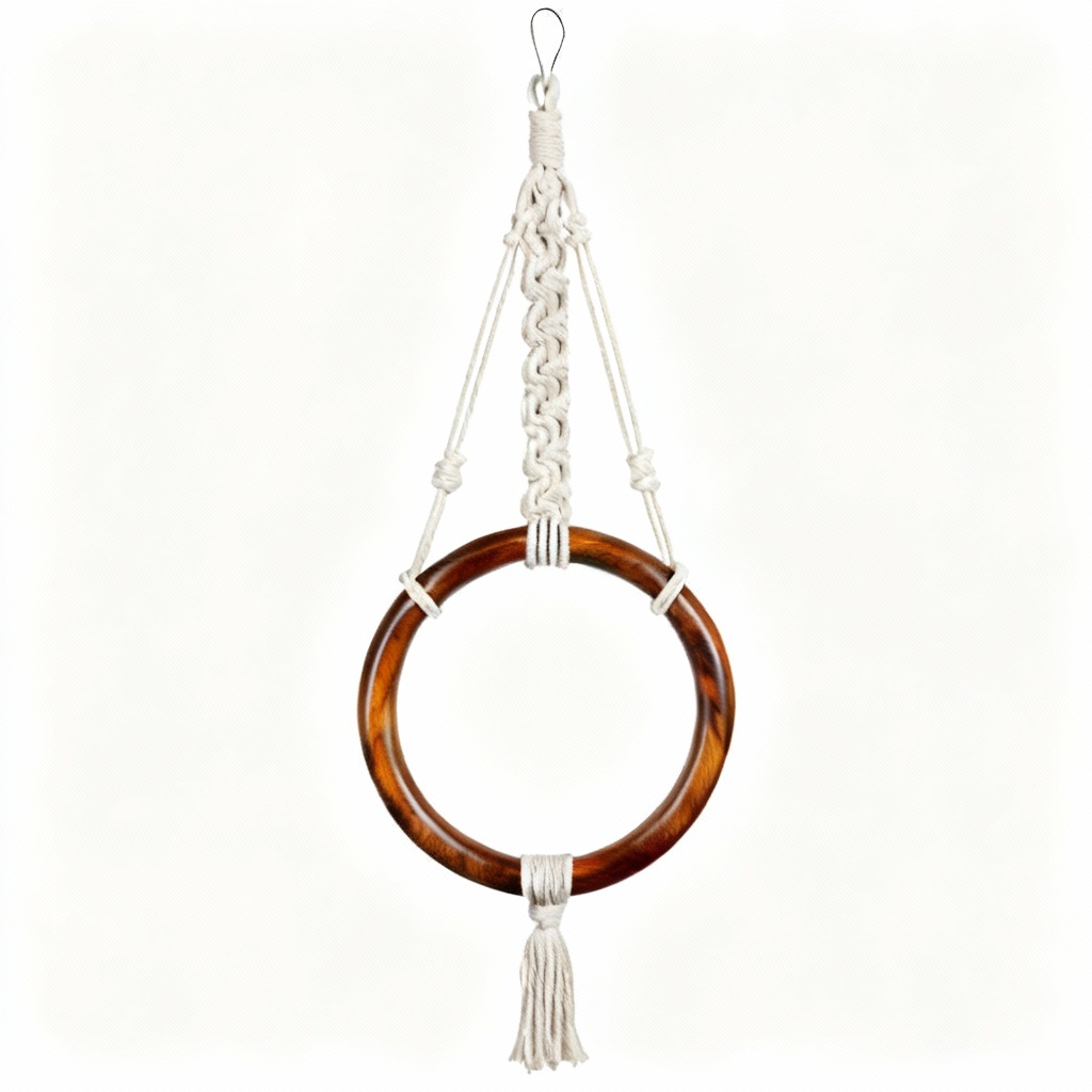 Elevate your indoor greenery with this stylish and modern macrame plant hanger. Handcrafted with durable, natural cotton rope and featuring a smooth, polished wood ring made from sustainably sourced oak, this hanger adds a touch of minimalist elegance to any space. Perfect for displaying your favorite potted plants, herbs, or succulents. Its simple yet sophisticated design complements a variety of decor styles, from bohemian to contemporary.