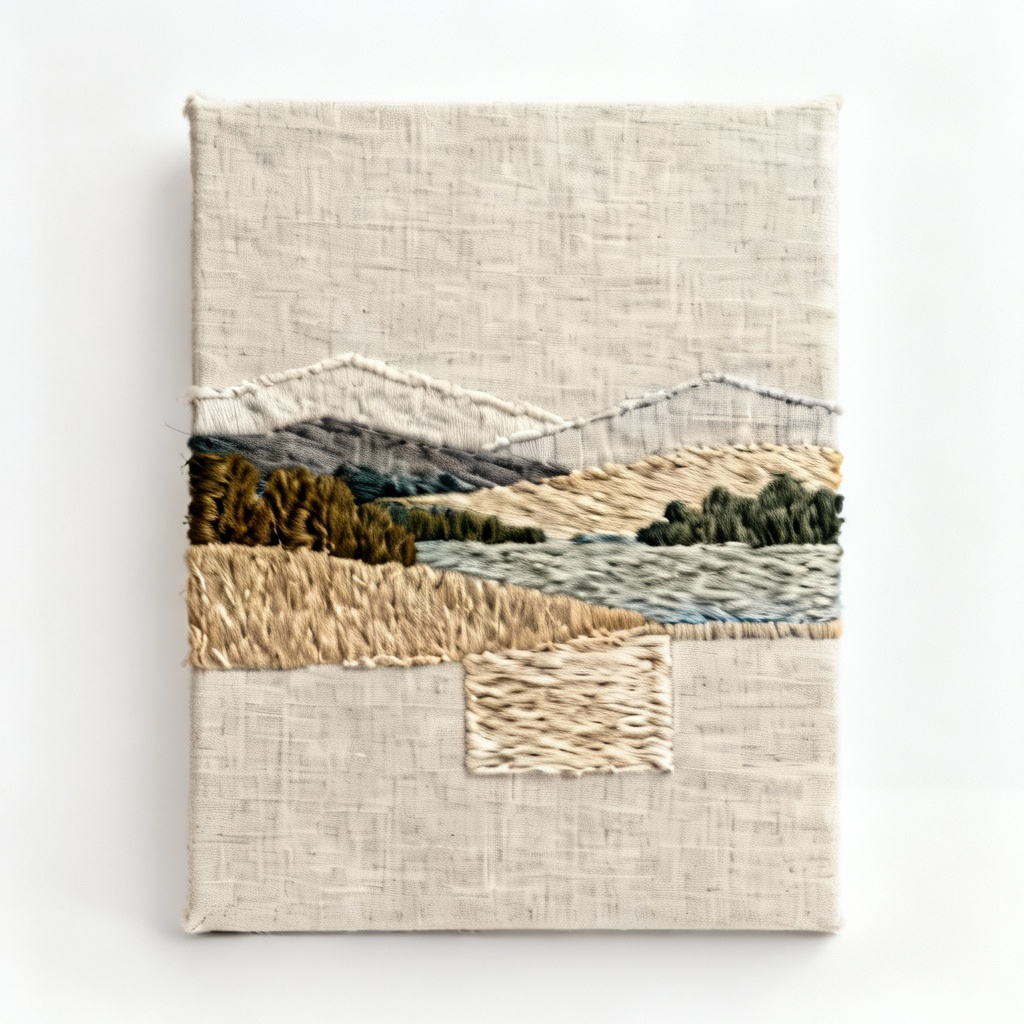 Bring a touch of serene artistry to your home with this unique textured fabric landscape collage. Handcrafted using various fabric scraps and meticulously layered onto a durable linen panel, this piece captures the subtle beauty of a tranquil countryside scene. The diverse textures of the fabrics create a tactile and visually engaging artwork. The varying shades of green, brown, and blue evoke a sense of peacefulness and natural harmony. The linen backing provides a sturdy foundation and a refined, neutral backdrop that complements the fabric collage. This piece features a stylized, almost abstract, representation of rolling hills and a distant treeline. Each piece of fabric is carefully chosen and placed to create depth and dimension, adding to the overall visual interest. The finished collage is mounted on an 8×10 inch linen panel, making it easy to display on a shelf, desk, or wall. A sawtooth hanger is included for convenient wall mounting. This fabric collage is a perfect addition to any room seeking a touch of handcrafted charm and understated elegance. The use of upcycled fabrics promotes sustainability and ensures that each collage is a one-of-a-kind creation. Due to the handmade nature of this item, slight variations in color and texture may occur, adding to its unique character. The collage is treated with a fabric sealant to protect it from dust and fading, ensuring its longevity. To clean, gently dust with a soft, dry cloth. Avoid direct sunlight and moisture to preserve the integrity of the artwork. Perfect for small spaces, bedrooms, living rooms, or as a thoughtful gift for art lovers and nature enthusiasts.
