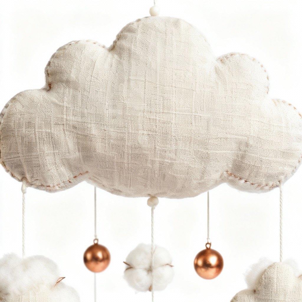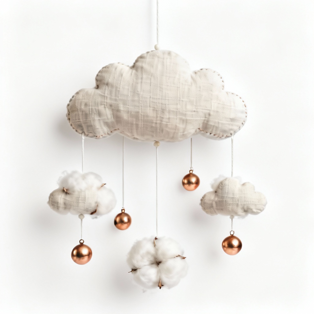 Textured Fabric Mobile with Cotton Clouds & Copper Accents